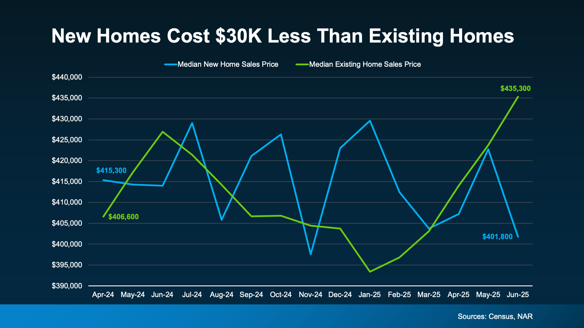 Data from Census and the National Association of REALTORS® (NAR) shows the median price of a newly built home today is actually lower than a home that’s been lived in already (an existing home):